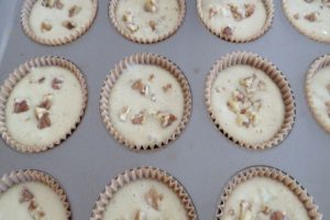 4. Line a muffin tray with baking cups and pour the batter into the cups. Do not fill the cups up to the brim of the baking cups. Sprinkle crushed walnuts on top of the batter in each cup. You could also add some crushed walnuts to the batter.